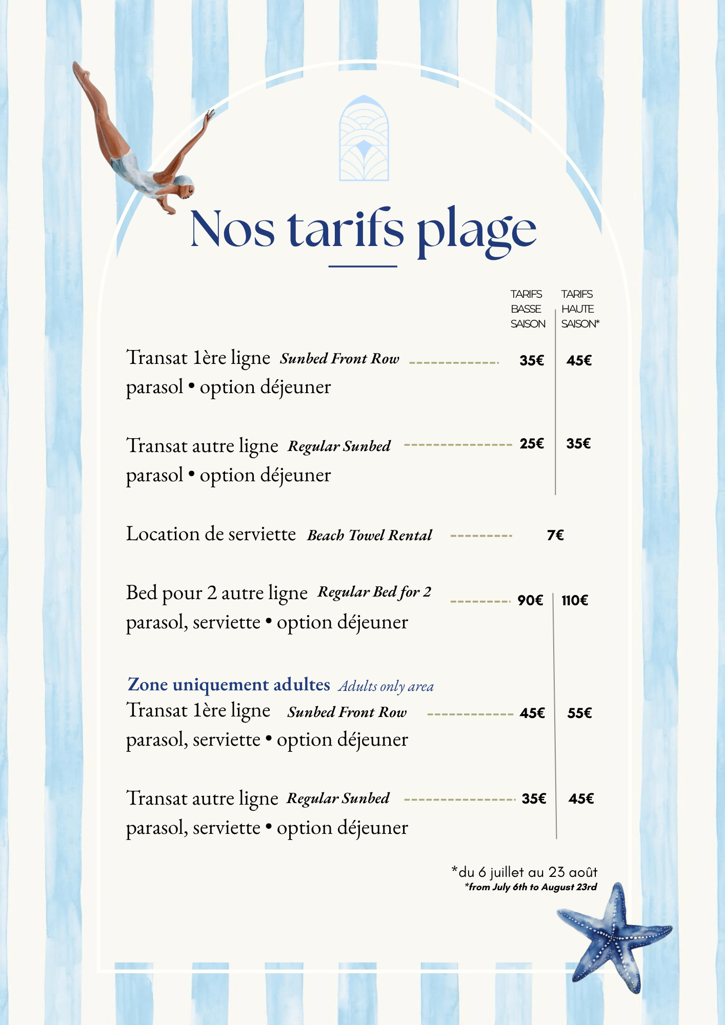 Relax on our private beach from 10 AM to sunset, with modern offerings and stunning views over the Bay of Juan-les-Pins.